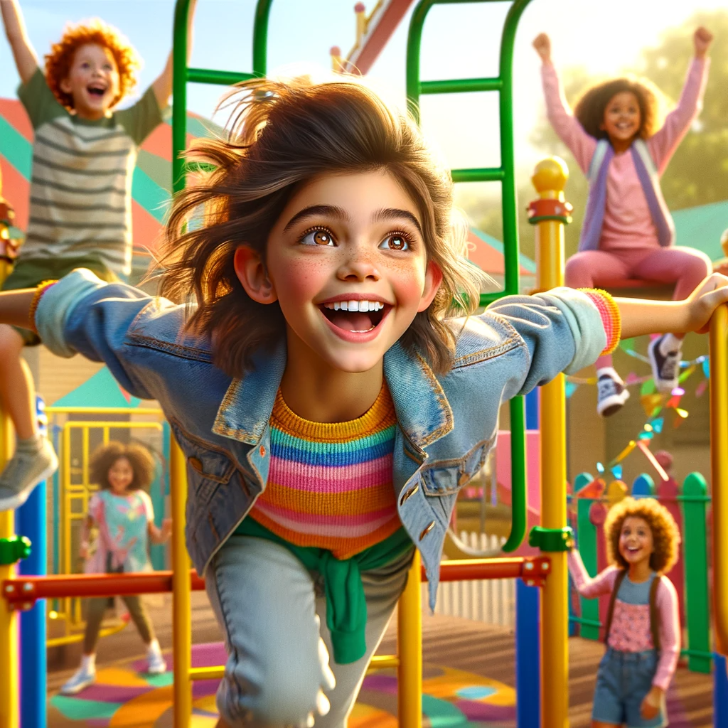 In a bustling neighborhood playground, a group of inventive children, led by a quick-witted girl named Ellie, are deep in an imaginative game. Ellie, renowned for her unique word creations, triumphantly completes a daring feat on the monkey bars, drawing cheers from her friends.