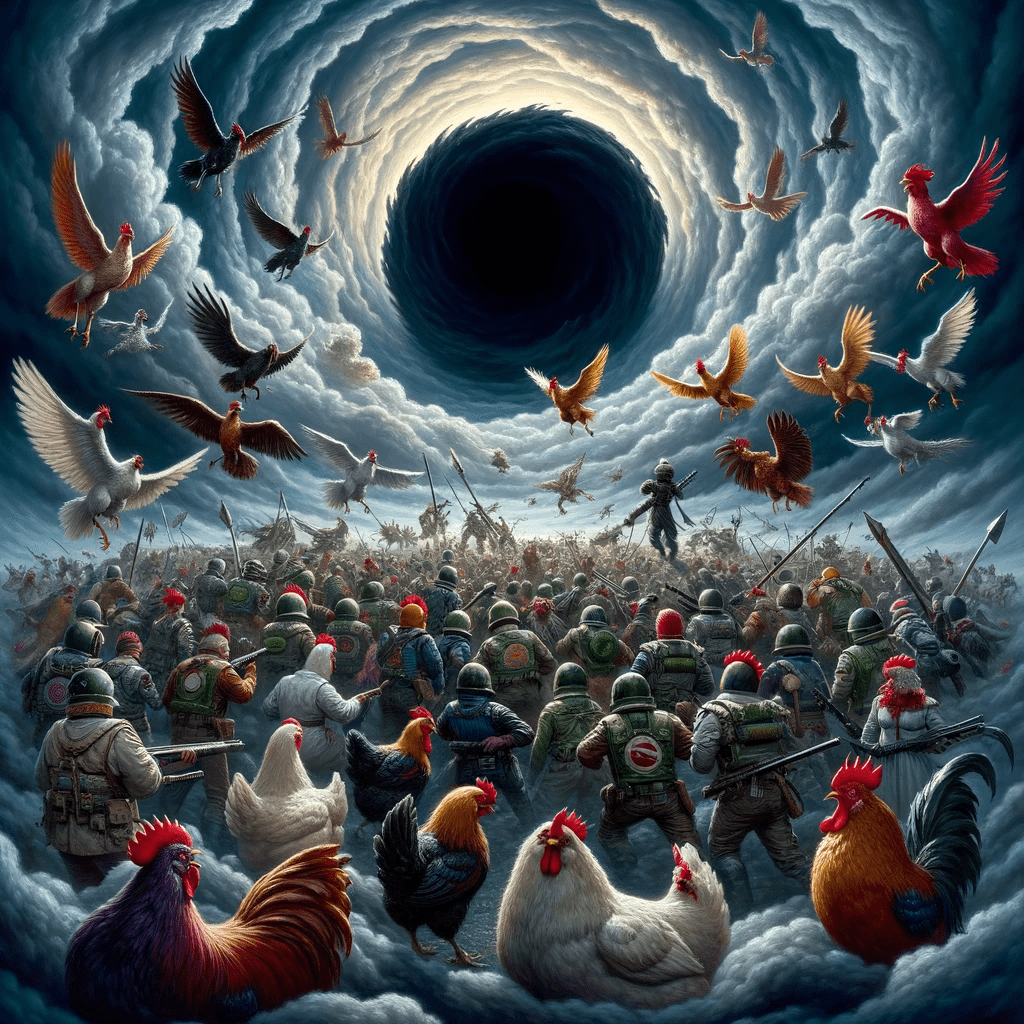 This singular focus strained their relationships, leaving them isolated, save for each other’s unwavering company. As they neared the end of their days, their fervent belief never wavered. On their deathbeds, with voices as frail as their bodies, they imparted their fears and convictions to their children. With a mix of reverence and solemn duty, these new bearers of the legacy listened intently, accepting the mantle that had defined their forebears’ existence. In their final moments, Chicken Little and the Boy Who Cried Wolf gazed one last time at the sky they had so feared, their last breaths whispering warnings of the impending doom they would never witness.