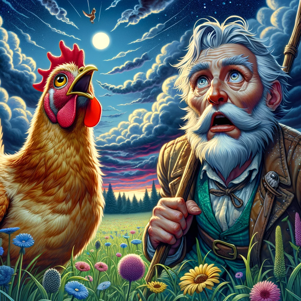 In the heart of a vibrant meadow, Chicken Little’s urgent cry shattered the tranquility: “The sky’s falling!” His eyes, wide with terror, mirrored the fears of his unlikely companion, the Boy Who Cried Wolf, now a grizzled man, his staff a silent witness to their shared obsession.