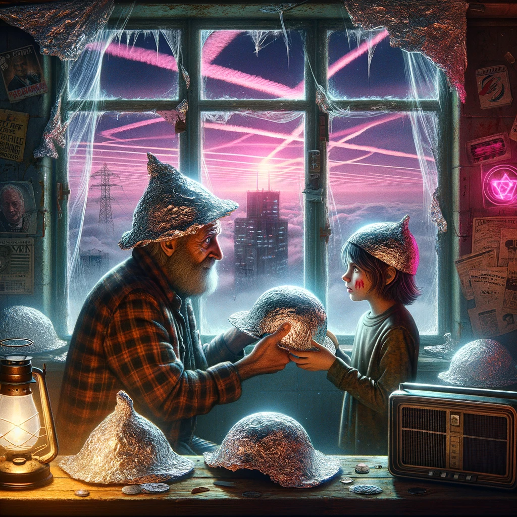 As the girl donned the hat, her eyes regained their lost spark. Tim, the Tinfoil Titan, wasn’t so alone anymore. In the twilight of a hypnotized world, he had found his apprentice, his heir to the mantle of vigilance. The fight against the Brain Slugs might be uphill, but with every new tinfoil-clad head, the glint of rebellion would grow brighter, a beacon in the chemtrail-choked sky. Tim smiled, a smile etched with hardship and hope. The Great Hypnosis might have lulled the world, but in his humble bunker, the revolution of aluminum foil had just begun.