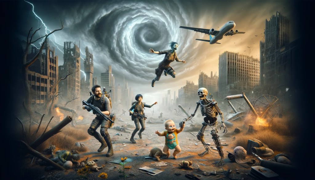 The world was a jumbled canvas of the macabre and the miraculous. Streets that once bustled with ordinary life now played host to a clash of forces no human had prepared for. Babies marched with the cunning determination of seasoned generals, their diaper-clad forms surprisingly menacing. The undead shuffled with an unnerving echo of forgotten purpose. Amidst it all, the heavens wept with abnormal fury, the storms a physical manifestation of the cosmic imbalance.