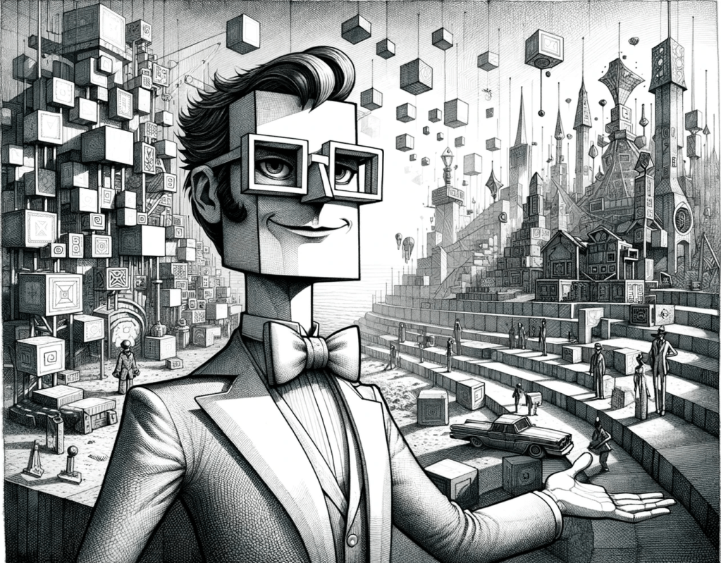 The image scans across and opens on Hornbert McBoxyface the Third, impeccably dressed in a suit as crisp as his geometric sensibilities. Square-framed spectacles perch on his nose, and a certain angularity defines his stance. You have know idea who this person is, but you imagine that in their home dimension anyone would recognize him instantly, for who else could it be than a pan-dimensional clone scion of the legendary Walter Cronkite lineage, known for their deep reverence for the right angles?