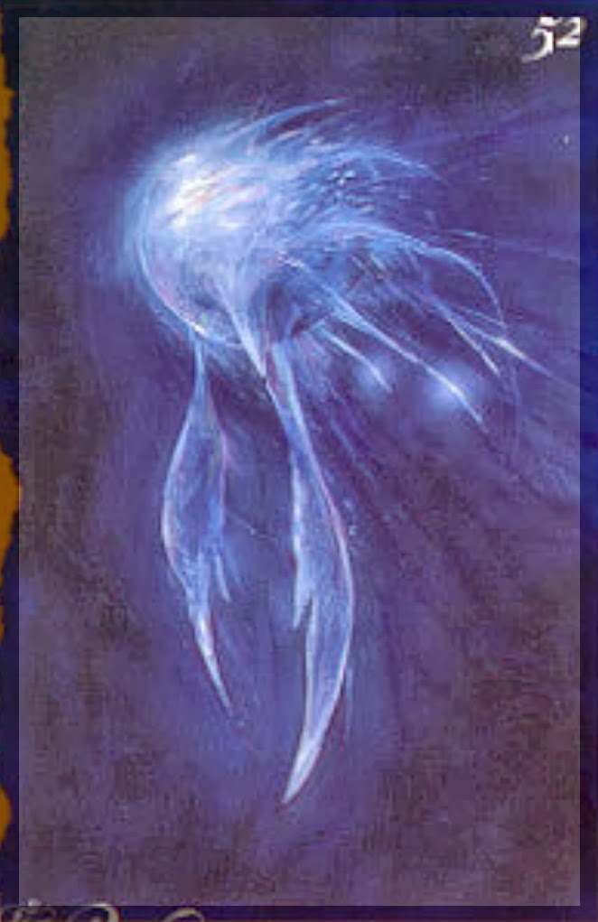 The Rarr is an interesting card. It differs from the other by not depicting a Faery per se. All the cards have shown small human-like creatures playing and dancing or lounging with other Fae. There are 14 cards with no shape or form to them except through vague means. They resemble Rorschach tests in bright color. So what makes the Rarr stand out? This Faery just screams pure energy to me. It’s a floating ball of light with wings to guide itself, but there are no eyes or ears for direction. To me, it almost resembles the creatures we’ve found at the bottom of the ocean, floating along with the current while emitting bioluminescence in the pitch black of the sea.